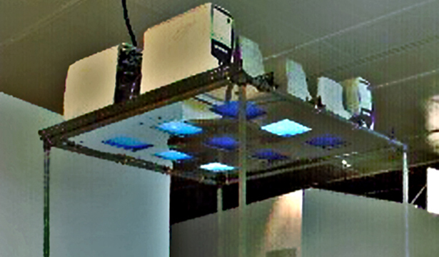 On both, ceiling and floor of the structure's device, there are reflective acrylic plates which reflect the participants found imersed in this environment, generating a mirrored relation and juxtaposing their images with the "electronic blue" of the screens, which is the base color proposed for the interactive animation. The images create a great blue mosaic, chained together they are arranged in possible oniric routes, which will be shared with other participants.