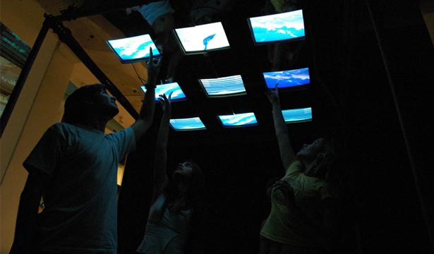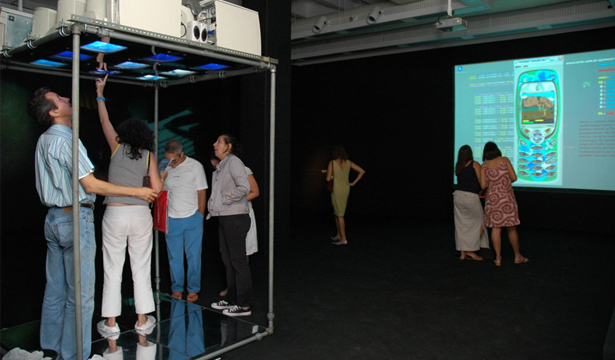 The device consists of 4 interactive terminals in a set of 9 monitors placed over the head of the participants, in which the navigation is done through the touch screen.