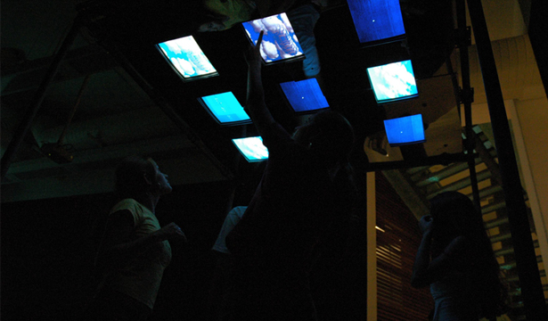 The participants will be moving around in the device, with their own touches they will be interrupting and modifying the sequences of sounds and images. Effectively, the visitor enters and modifies the inner space. The animation will become fragmented by the participant, who is who adds "unpredictable" rhythm to the device, incorporating the presence of the participants in what concerns rhythm and space.