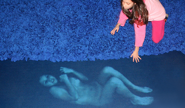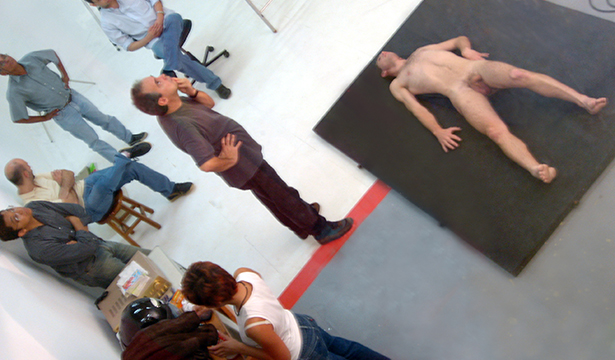 The installation is set up in a half-open space, as if it were a town square, where there could be a lot of people moving around, but that is not well-lit. In the center of the space there is a large heavy totally handmade blue rug, like those made by prisoners' wives. The series of images as well as the spots onto which they are projected occur in a random way. Once a person steps onto the rug two things happen: an image of a nude body is projected onto the ground and a strong wind is created by a fan from a wall facing the spectator. The only noise is that of the wind from the fan which creates tension and instability. As for the images, from the moment that they are projected onto a given spot tension zones are generated tension with the result that the actions of the bodies react when the spectators get closer and when they move away. When the spectators reach the bodies the situation becomes irreversible with the death of the characters and the disappearance of the images. An interval without any projections or actions follows.