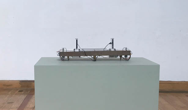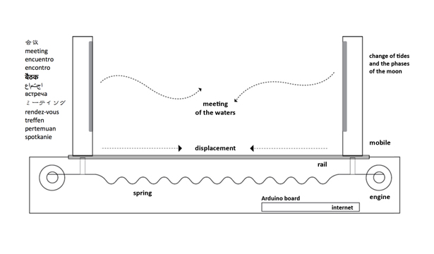 The spring, at the same time in which it extends, coils to mark the space and the course of the flow/movement. In the brief moments of near-touching, at the limit of the spring’s approximation and coiling, it is possible to notice a light combination of brown and black of the waters that mix and simultaneously, the impossibility of the encounter.