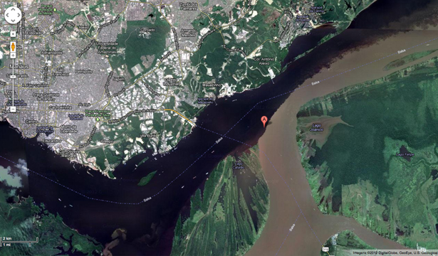 Two mobile phones exhibit videos filmed during a trip up the Amazon River composed of flows of water in two distinct tints: On the one side we have a predominance of black-colored water, on the other, brown-colored.