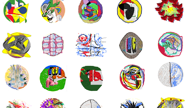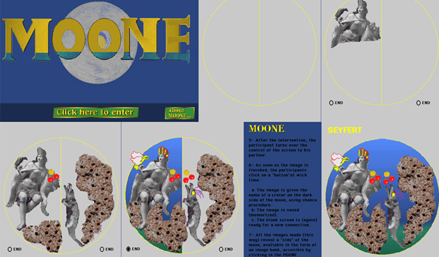 Procedure: 1- A space (circle) divided in two appears on the screen. 2- The two participants work alternately, one on the left side, the other on the right. 3- Each participant's work consists of making whatever he wants on his half of the screen (drawing, photo,..., any kind of digital image, taking into account the other's participation, thus establishing an dialogue in images. 4- A participant has access to only one half of the sphere. He can possibly take elements from the other side (for example by copying and pasting) but he can't intervene graphically in the composition of the other half. 5- After the intervention, the participant turns over the control of the screen to his partner. 6- As soon as the image is finished, the participants click on a "button" at which time: a: The center line disappears. b: The image is given the name of a crater on the dark side of the moon, using chance procedure. c: The image is saved (memorized). d: The image disappears. e: The blank screen is (again) ready for a new connection. 7- All the images made (this way) reveal a dark side of the moon, available in the form of an image bank, accessible by clicking on a "point" of the moon map created.